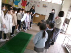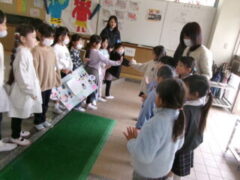 1月に1年生は愛徳幼稚園のお友達と交流をしましたが、今日、来年度入学予定の園児さんたちが先生いっしょにお礼に来てくれました。メッセージやかわいい飾りつけものをプレゼントしてくれました。ちょうど、大休憩だったのでみんなでお迎えできませんでしたが、お迎えできた1年生は大喜びでした。園児の皆さん、4月に元気に入学して来てください。みんなでいっぱい遊びましょう。