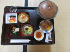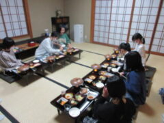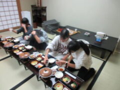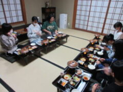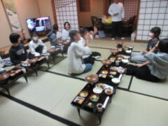 子供たちも楽しみにしていた部屋食です。お茶で乾杯している部屋もありました。食事の後は、夜の京都へ出かけます。