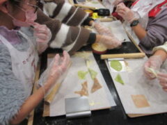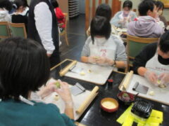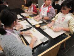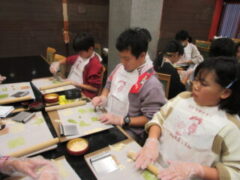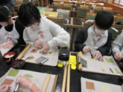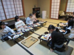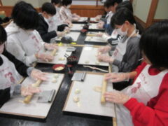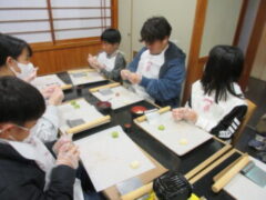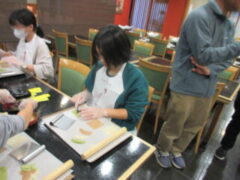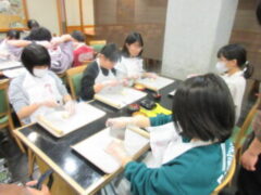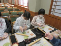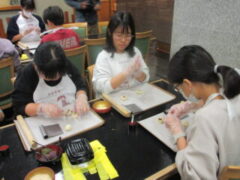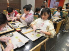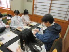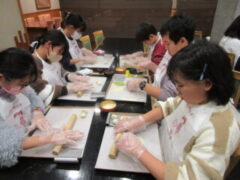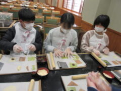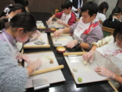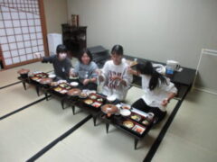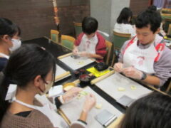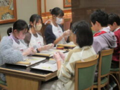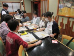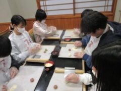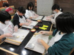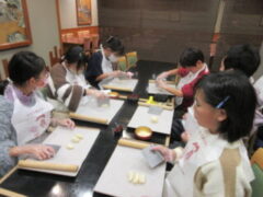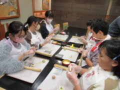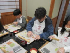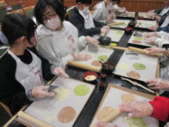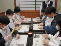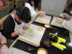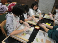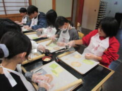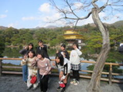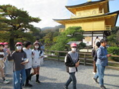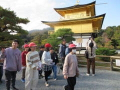 2日目、一番目のプログラムは、八つ橋づくりでした。みんな集中して上手に作っていました。持って帰りますので、食べてみてください。次は金閣寺に向っています。