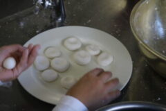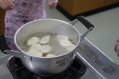 5・6限に、家庭科室でお団子を作り、その後、葉っぱがいっぱいになった桜の木の下で、お花見をしました。