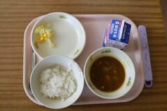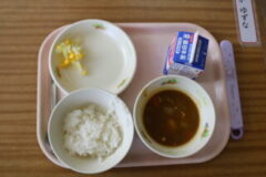 今日の給食はカレーライス、コーンサラダ。長い針が「10」までに食べ終わりましょう。