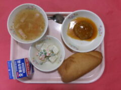 今日の献立は、パン 牛乳 煮込みハンバーグ ポテトサラダ マカロニスープ です。