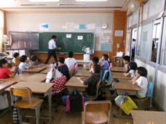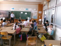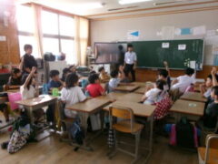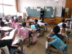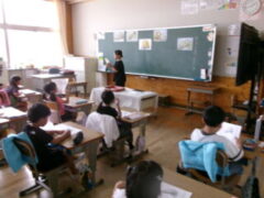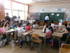 4年生は音楽で「おまつりリレー」をしていました。おまつり おまつり おまつり・・・9回の歌詞に休符などつけながら自分でリズムを考え、そのリズムを受けて次の人がリズムのリレーをして楽しんでいました。