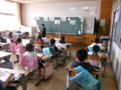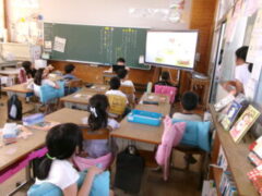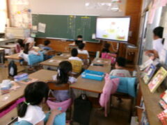 1年生は算数のプリントが終わった後、パソコンでe-ライブラリーに取り組んでいました。
