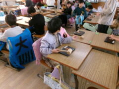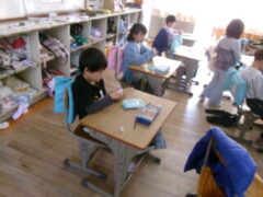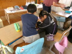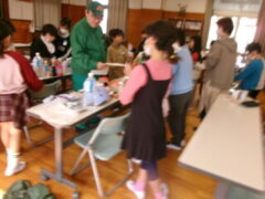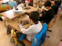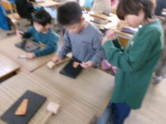 3年生は、先日,皮革工場に見学に行きましたが、頂いてきた革(皮)切れを使ってキーホルダーをつくりました。まず、水にぬらしてます。それから型を選び型押しをしました。子供たちは、お気に入りの革(皮)に思い思いに好きなデザインの型を選んで打ったり、ABCのアルハベットを自分の名前やイニシャルを楽しそうに打ったりしていました。最後にクリームを塗ります。みんなオリジナルのキーホルダーができるので、瞳が輝いていてとても楽しそうでした。