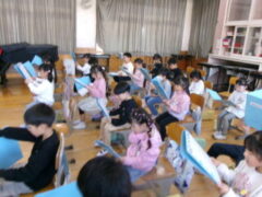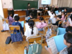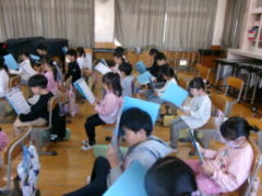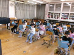 1年生は音楽で「あおい そらに えをかこう」をはじめ、いくつかの歌を楽しそうに元気よく歌っていました。