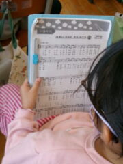 2年生は算数でずっと九九を学習していますが、この時間は、復習も兼ねて九九カードの読み上げを頑張っていました。