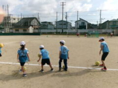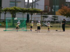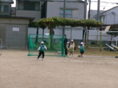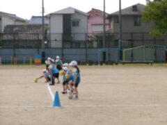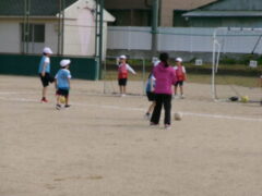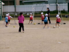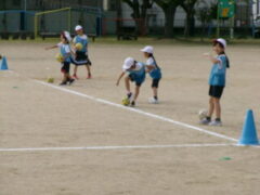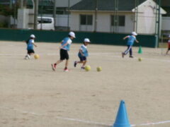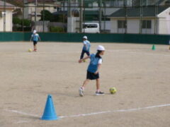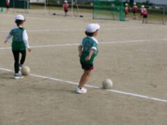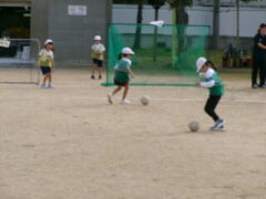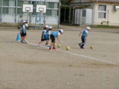 1年生は体育でサッカーに挑戦していました。3種類のゴールがあり、大きいゴールが1点、小さいゴールは3点と差をつけてゲームを楽しめるように工夫していました。攻め側と守る側が交代しながら何点シュートできるか競い合っていました。