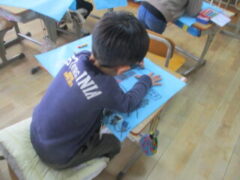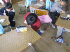 1年 1年生は机をゴシゴシ擦っていました。入学した時に机に貼っていたネームシールをはがしてきれいにしていました。4月から入ってくる新1年生のために頑張っいていました。もうすぐお兄ちゃん、お姉ちゃんになります。