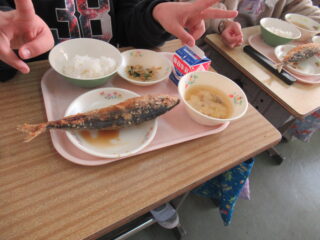 この日の給食は、5年生には丸ごとのアジが提供されました。