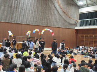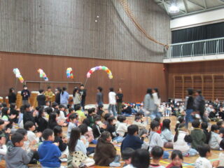 全校児童が体育館に集まり、6年生に歌や演奏、メッセージをプレゼントしました。
