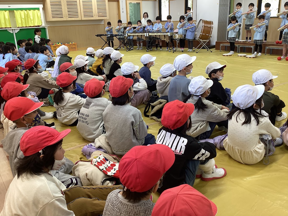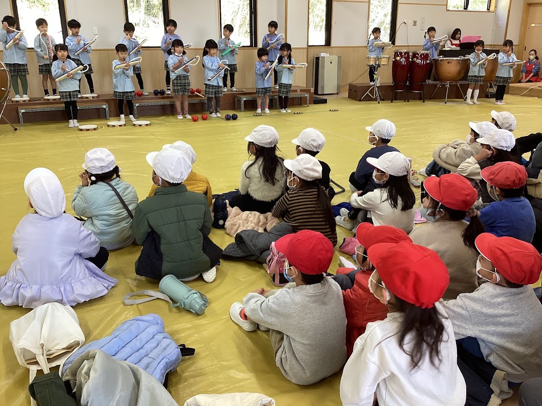 園に着くと、まずは「勇気100%」の合奏でお出迎えしてくれました。幼稚園児と言えども、たくさんの楽器を使って、リズムに合わせて演奏する姿は頼もしく、やはり園の中では一番お兄さん・お姉さんなんだなと感じました。