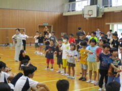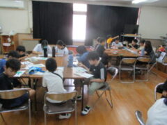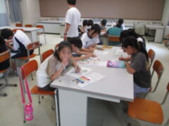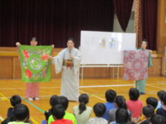 26日(金)文化庁主催の巡回公演として「琉球舞踊」に触れるイベントがありました。公演してくれたのは沖縄芸大OB・OGの方々で、「琉球舞踊」を愛する明るくて楽しいグループでした。初めに「琉球舞踊とは何か?」について学び、続いてクイズを交えながら「三線(さんしん)」を聞き、そしてみんなで舞踊にチャレンジしました。手に「四つ竹」と呼ばれる楽器を握り、乾いたよく響く音を鳴らしながら舞います。ゆっくりした動きは沖縄の「風」や「海」や「空」を表すそうで、優雅で美しいものでした。休憩後は琉球舞踊の模様の色付け体験をしました。3つの部屋に分かれて中学生と一緒にしました。懐かしい”先輩”と一緒にする色塗りにちょっと興奮気味に子供たちも取り組んでいました。