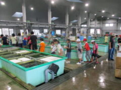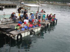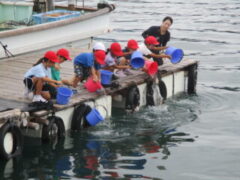 23日(木)午後、恒例の「稚魚放流」をしました。これは「ちゃりこ」と呼ばれるマダイの稚魚を加太港内に放流する、地域と学校が連携した加太小ならではのイベントです。小学校から徒歩で20分程度、児童全員で加太漁業協同組合様の集荷場横に行きました。到着するとすでに漁船に乗ったたくさんの漁組の方々が準備を進めてくれています。早速幼稚園児から順に子供たちは浮島に渡り、漁船からバケツにすくってもらった「ちゃりこ」を手に、海に放流しました。「大きくなってね!」「もどっておいでよ!」など、子供たちは「ちゃりこ」に優しく声をかけながら、元気に泳いでいく姿を見守っていました。