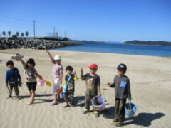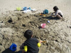 1年生は「さらさら ふわふわ かたちにへんしん」という単元の学習で、学校の砂場を使って「造形遊び」を楽しみました。その単元のまとめとして、砂がいっぱいある砂浜に出かけて、思い思いの「造形遊び」をしようと計画したわけです。広い広い北の浜に到着して驚いたのは、誰一人ビーチにいないことでした。1年生が独占です。波打ち際まで行くと、早速もってきた道具を使って砂を掘り始めました。ほどなく海まで続く”水路”を作ろうとする子や、どんどん深く掘ろうと頑張る子が出てきて、「だれか手伝ってー!」「いいよー!」みんなみんな優しさいっぱいに楽しんでいる様子でした。最後にはずぶぬれになって、砂だらけになって大変でしたが、「はーい、時間なので終わりでーす。」と担任が話しても、まったく活動をやめようとしないくらい、楽しい時間になっていました。