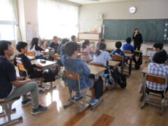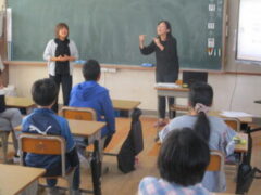 和歌山市の聴覚障碍者協会から2名のスタッフさんを迎え、単語や会話を中心にたくさんお話をしながらの1時間でした。でも実際は静かな教室での授業。手話の勉強ですから、説明以外、声を出してのやりとりはほとんどありません。でも子どもたちがスタッフさんの手や顔の表情を見る集中力はとても高く、全員が”一生懸命”の時間になっていました。「加太は海がきれいです。」「観光には淡島神社や友ヶ島がいいです。」などの手話を教えてもらい、きっと今晩おうちで披露してくれることでしょう。