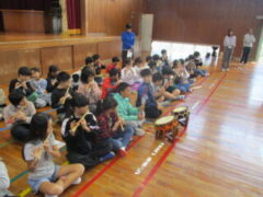 スポーツ祭が終わったタイミングをうけて、毎週火曜日6時間目に恒例の獅子舞練習が始まりました。地域の指導者と共に今年度初の練習です。締め太鼓を打つ子、獅子に入る子、それぞれ6年生を中心に決まり、その役を持たない子はお囃子の篠笛役になります。昨年の発表経験や加太地域の自治会でも練習している子も多いので、練習は初めからでもきれいな音色が響きます。その音色を聞きながら、小規模特認制度で今年から参加する子も見様見真似でがんばっています。「すぐにはできなくてもいいんだよ」「ちゃんとできるようになるからね」声を掛け合いながら、みんなで「加太の獅子舞」を高めていきます。今年度もまず目標にするのは12月5日(金)に開催される「和歌山市音楽会」での発表です。