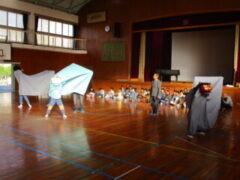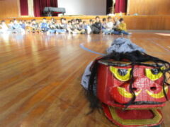 12月5日午前に開催される「和歌山市音楽祭」に向けて、獅子舞練習もどんどん熱を帯びてきています。火曜日6時間目の練習の様子の写真です。獅子も3体、迫力満点に舞えるようになってきました。お囃子の篠笛の音量も上がってきましたし、全体のレベルが急上昇中です。地域の伝統芸能とその継承の意味でも子供たちには頑張ってほしいです。