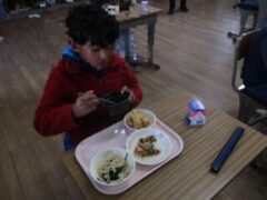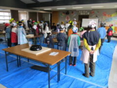 麺をゆでる間、教室に戻って4時間目の学習ですが、途中、玄関前に駐車している「丸亀キッチンカー」を見ることもできました。給食の盛り付けが終わり、いよいよ食べ比べが始まりました。「こっちの方がしょっぱい!」「こっちの方がもちもちしてる!」「こっちの方がおいしい!」「わたしは絶対こっち!」食レポもなかなかのものです。おいしくいただきました。その後閉会式では、「きむ兄」さんから「楽しんでもらえてうれしかったよ」というお話を聞き、5年生が児童代表で感想とお礼を発表しました。全員でお礼を言って、イベントは終了しました。