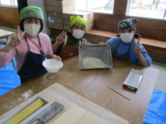 4日(木)、6年生が修学旅行でお留守の中、学校では「麵打ち体験」としてみんなでうどん打ちを体験しました。