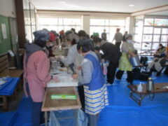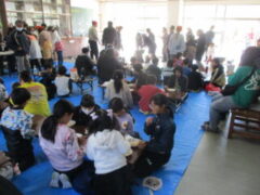 8時45分、会長の挨拶で会が始まりました。1臼目は鏡用にしましたが、2臼目から子供たちが杵を使って打ち始めます。初めは就学前の子供たちからです。ギャラリーに見つめられながら小さい杵を使って一生懸命に打ってもちつきをしていました。続いて1年生から2年生、3年生、4年生、5年生、6年生、中学生の順で3臼くらいかけてもちつきをしました。土曜日なので子供たちも全員参加が叶いませんでしたが、かけつけた小学生は楽しそうに打っていました。つきあがったお餅は、待ち構える保護者の手ですぐに丸餅にされ、醤油、きな粉などの味付けで子供たちや保護者に振舞われました。柔らかくておいしかったようです。会の最後には子供たち全員で保護者やお手伝いの先生方に「ありがとうございました!」と元気にお礼を言って、お土産のお餅を手に楽しかった「お餅つき大会」は終了したのでした。