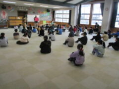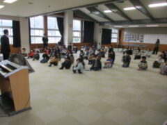 24日(水)クリスマスイブは終業式の日でした。朝、子どもたちがサンタクロースのプレゼントのお話をしながら、多目的ルームに集合しました。まず式に先立って、児童会から12月の誕生日の子どもの紹介がありました。名前を呼ばれて前に並んだ12月生まれの子どもたちに向かって、みんなで「おめでとう!」と祝いました。前に出ていた子も「ありがとう!」とお返事していました。