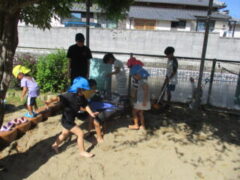 19日1時間目、あおぞら学級と幼稚園のお友達とで「どろあそび」をしました。日陰はちょっと涼しくなったこの日でしたが、日なたはまだまだ日差しがじりじり。そんな中、幼稚園の砂場に水を運んで、手触り、足の感触を楽しむ時間が始まりました。泥団子をつくったり、「コンクリート完成!」と左官屋さんのように泥を塗り始めたり、みんな生き生きと活動していました。幼稚園の子が小学生の子のところに自然にやってきて一緒に交流する姿も見られ、幼小連携を進める加太”らしさ”も見られました。