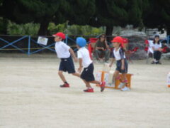 まず1・2年生と幼稚園児による種目からスタートでした。この種目は長い長い時間をかけて児童園児たちが「どんな運動がしたいかな」をスタートに考えた種目でした。アイデアを出して、実践して、考え直して、またやってみて・・・。苦労の末に到達した種目でしたので、自分たちを応援する声がとっても元気いっぱいだったことに気づいたでしょうか?すばらしいリレーの姿でした。