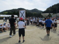 次は体育委員会の児童が考案した綱引きでした。練習では毎回子供同士で対戦していて、この日は初めて保護者の方々が参加します。つまりどんな結果になるか、練習からは予想できないのでした。縦割りグループごとに児童と保護者が一緒に綱を引いて対戦しました。結果は白組が2連勝して優勝!なんと練習からこの日まで、白組は一度も勝ったことがありませんでした。白組の子供たちには、とてもとてもうれしかったと思います。