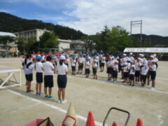 児童会の楽しい劇からスタートし、始まりの会で校長先生から励ましの言葉をもらい、児童代表のあいさつ、そしてエール交換と続きました。エール交換では子供たちのモチベーションも最高潮。そしてウォームアップ体操で「エビカニクス」をみんなで踊ると、もうみんなドキドキわくわくです。