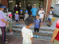 23日(木)午後、恒例の「稚魚放流」をしました。これは「ちゃりこ」と呼ばれるマダイの稚魚を加太港内に放流する、地域と学校が連携した加太小ならではのイベントです。小学校から徒歩で20分程度、児童全員で加太漁業協同組合様の集荷場横に行きました。到着するとすでに漁船に乗ったたくさんの漁組の方々が準備を進めてくれています。早速幼稚園児から順に子供たちは浮島に渡り、漁船からバケツにすくってもらった「ちゃりこ」を手に、海に放流しました。「大きくなってね!」「もどっておいでよ!」など、子供たちは「ちゃりこ」に優しく声をかけながら、元気に泳いでいく姿を見守っていました。