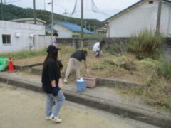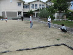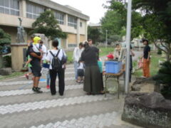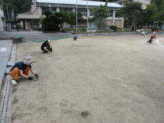 19日1時間目、あおぞら学級と幼稚園のお友達とで「どろあそび」をしました。日陰はちょっと涼しくなったこの日でしたが、日なたはまだまだ日差しがじりじり。そんな中、幼稚園の砂場に水を運んで、手触り、足の感触を楽しむ時間が始まりました。泥団子をつくったり、「コンクリート完成!」と左官屋さんのように泥を塗り始めたり、みんな生き生きと活動していました。幼稚園の子が小学生の子のところに自然にやってきて一緒に交流する姿も見られ、幼小連携を進める加太”らしさ”も見られました。