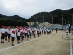 児童会の楽しい劇からスタートし、始まりの会で校長先生から励ましの言葉をもらい、児童代表のあいさつ、そしてエール交換と続きました。エール交換では子供たちのモチベーションも最高潮。そしてウォームアップ体操で「エビカニクス」をみんなで踊ると、もうみんなドキドキわくわくです。