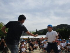 最後の種目は恒例の〇×クイズでした。保健給食委員会の児童が企画してくれた種目ですが、今年もたのしくも「へーえ」と感心する問題を用意してくれていました。縄跳びやサッカーのリフティングなど先生方のパフォーマンスが出題され、6年生対6年生担任のジャンケンでは6年生担任が圧勝していました。この名物となった先生VS6年生のジャンケン勝負は、始まってから3年。子供の1勝2敗です!