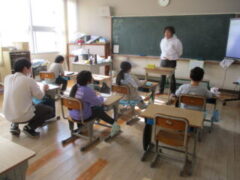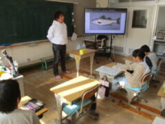 ゲストティーチャーは加太小学校で獅子舞も教えてくれている現役の漁師さん。「昔はスズキという魚がたくさん獲れたけど、今、とても少なくなりました。」「カツオの中でもスマガツオという魚は、昔はまったく獲れなかったけど、このごろ少しずつ獲れるようになってきたのですよ」「水温が昔から少しずつ変わってきて、加太より暖かいところの魚が獲れ始めているみたいです」など環境の変化と魚の関係を、子どもたちにもわかりやすく説明してくださいました。子どもたちは事前に質問を用意していたのですが、メモを一生懸命とって頭の中もいっぱいになったようで、あまり聞けないようでした。それでも「一番大変なお仕事は何ですか?」など質問して、自然が相手のお仕事の大変さを教えてくれていました。印象に残ったのは、魚の価格がそれほど上がらないのに、燃料費がかなり上がっている、というお話で、漁師さんのご苦労を知ると魚を獲ってくれることに感謝でした。最後まで優しく語り掛けてくれるような1時間でした。