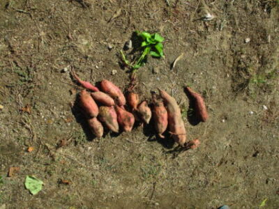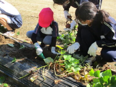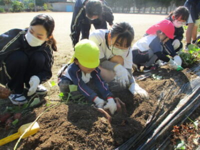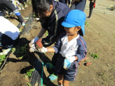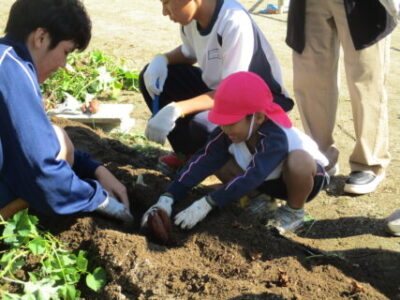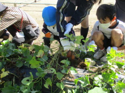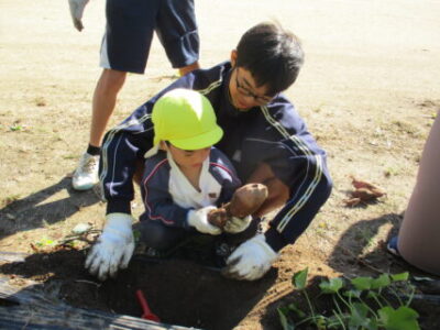 加太中学校2年生のお兄さん・お姉さんと一緒に植えたさつまいもを収穫しました。