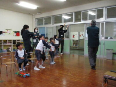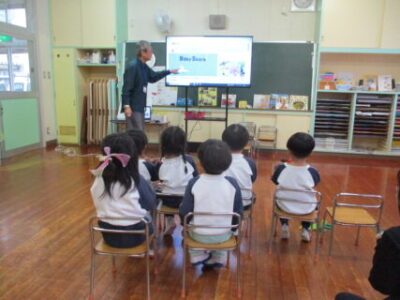 十河先生の「えいごのじかん」は、幼稚園の子供たちが楽しく英語に触れて遊べるようにと、様々な要素を取り入れ、工夫してくださっているので、毎回、子供たちはとても楽しみにしていると同時に、いざ始まると楽しくて、あっという間に時間が過ぎてしまいます・・・