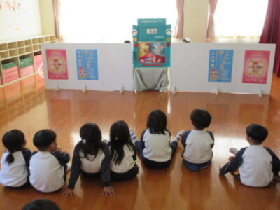 初めに、幼稚園の遊戯室でゴミの分別やリユースやリサイクルのお話を聞きました。リリクルちゃんとパッカーくんの紙芝居、収集作業員さんによる、ゴミの出し方や分別の仕方の劇を見せてもらいました。「ゴミは朝8時までに出す」「空き缶やビン、ペットボトルは資源ゴミだから水曜日に出す」「ペットボトルは作業員の方の服に生まれ変わる」など、たくさんのことを教えてもらいました。