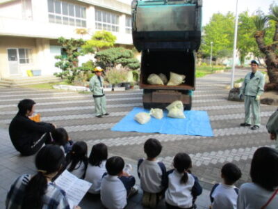 その後、小学校の玄関前に移動して、パッカーくんを見学させてもらいました。普段見ることのできないパッカーくんの“お腹の中”を見せてもらったり、どうやってゴミを食べているのかを見せてもらったりしました。