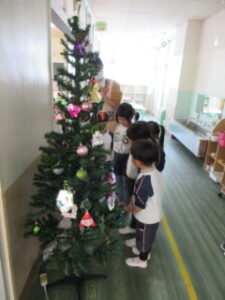 幼稚園にクリスマスツリーを飾り、クリスマスの歌をみんなで歌って、すっかりクリスマスモードの幼稚園です。