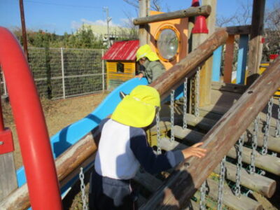 つるつる山の上で「名前、なんていうん?」と尋ねてもらった3歳児さん。「○○ ○○」と自分の名前を伝えて「○○ちゃんね」と呼んでもらう姿も見られました。