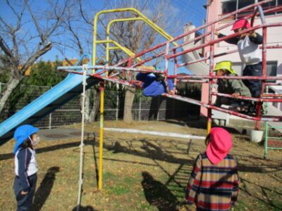 「こんなこともできるよ」「すごい!」遊具の楽しい遊び方をやって見せてくれました。