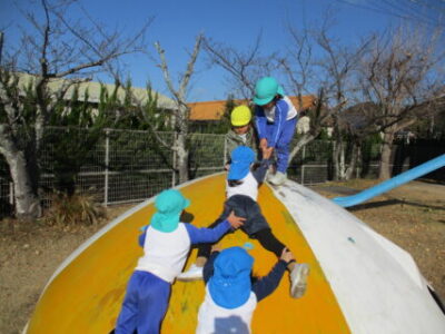 つるつるしている山、どうやって登るのかな・・・悩んでいると、登り方をやってみせてくれ、下から押し上げてくれたり、上から手を握って引っ張り上げようとしてくれたり・・・至れり尽くせりのサポートをしてくれました。