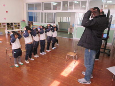 まず初めはALTの先生と一緒に英語版の「あたま・かた・ひざ・ポン」をしました。