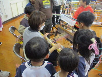 みんなで先生から織り方を教えてもらって、早速、製作タイムです。