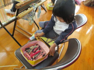 最終回の4回目。今回は、さくら・すみれ組さんが一緒に『さをり織り』に挑戦しました。