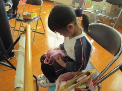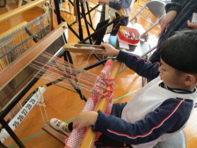 織り機が大きいので、幼稚園の遊戯室ならと、あおぞら学級のみんなも移動してきました。