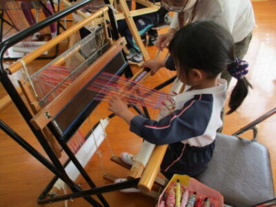 織り方は“糸を通す、ペダルを踏む、機械で糸を寄せる”の繰り返しで、子供たちにも分かりやすく、どんどん織り進めていきました。