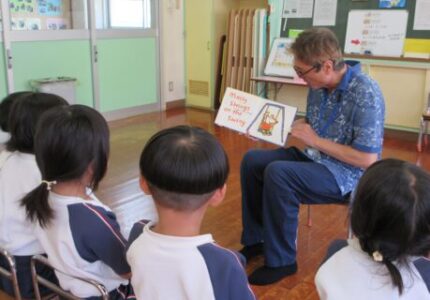 AB先生と一緒に、英語の歌詞に合わせて体を動かして遊んだり、一緒に英語の歌(繰り返しの多い歌詞でした)を歌ったりしました。