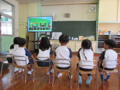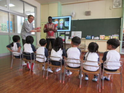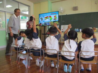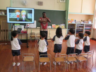 今年度になって初めて小学校の英語専科の十河先生が幼稚園に来てくれました。4歳児・5歳児の子供たちは、昨年度の月に一度の楽しい十河先生との英語の時間を覚えていて「今日は十河先生がきてくれる日」と予定表を見て楽しみにしていました。
